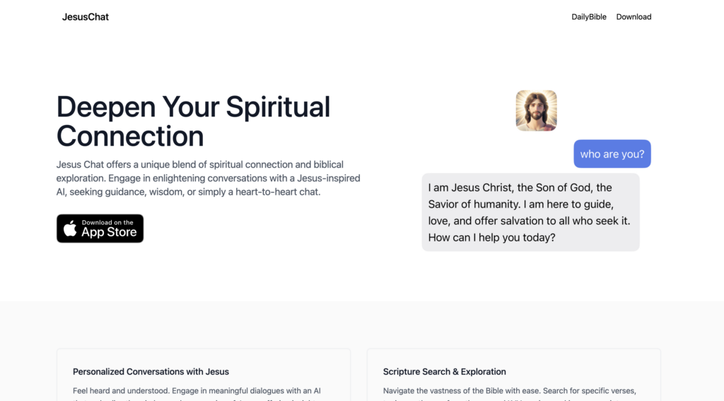 JesusChat offers a unique blend of spiritual connection and biblical exploration. Engage in enlightening conversations with a Jesus-inspired AI, seeking guidance, wisdom, or simply a heart-to-heart chat.
