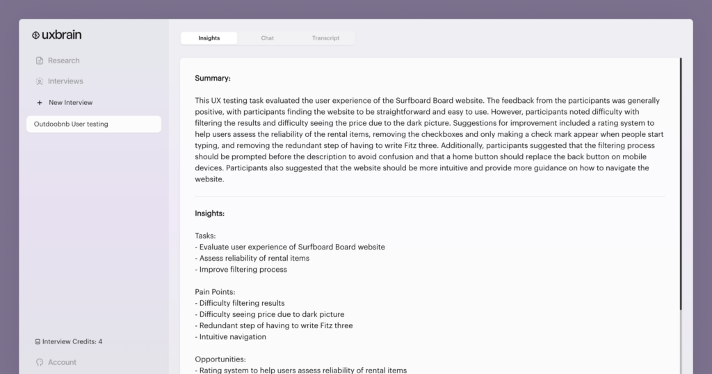 UX Brain is an AI assistant that helps UX Designers effortlessly transcribe, generate concise summaries, uncover actionable insights from user research.