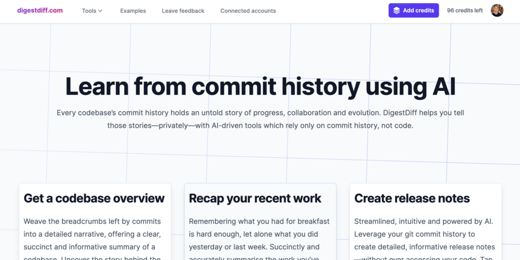 Every codebase’s commit history holds an untold story of progress, collaboration and evolution. DigestDiff helps you tell those stories—privately—with AI-driven tools which rely only on commit history, not code.