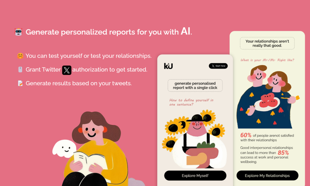KnowU, an AI-powered product, generates personalized reports for you and your friends based on your Twitter posts. The report, covering 10,000+ words, 9+ relationship aspects and 5+ dimensions, offers analysis of your view of love, guidance on self-investment, compatibility between you and your friends and the advice in this relationship, etc.