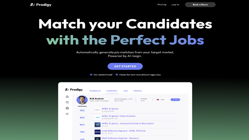Prodigy AI seamlessly matches candidates to jobs, whether from job boards or your ATS. Upload a role for instant top candidate matches, or a candidate to find ideal job opportunities. Speed up candidate selection, exceed client expectations, and simplify recruitment. Join the future of recruiting now!