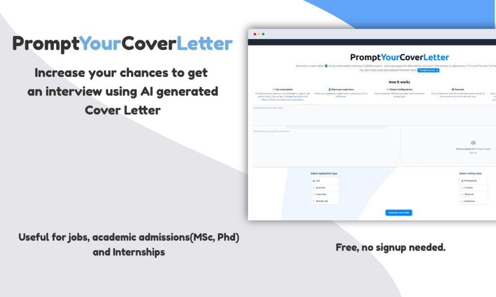 AI CV Now streamlines your job application process with professional resume and cover letter creation in minutes. Choose from a variety of attractive templates, get expert writing guidance, and access job-winning examples. Elevate your job search and stand out to employers effortlessly. Get hired faster with AI CV Now.
