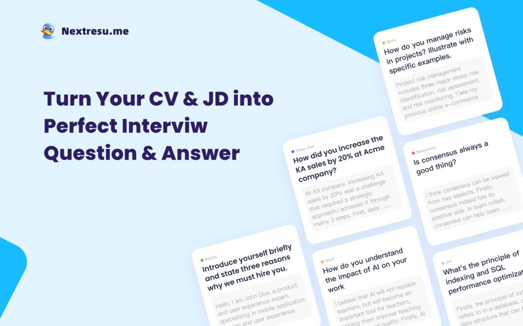 NextResu.me revolutionizes your mock interview preparation by tailoring every question to your unique resume and job requirements. Unlock precise responses to master every real interview scenario. Exceptional interview performance is now at your fingertips with NextResu.me :D