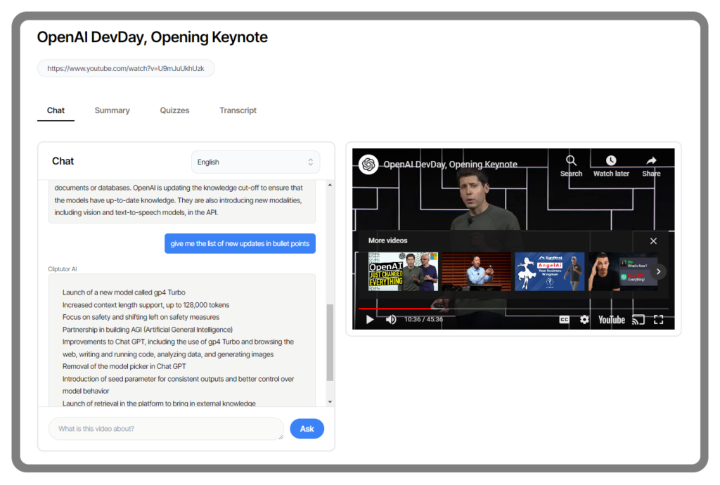 ClipTutor revolutionizes learning by turning YouTube videos into personalized tutors and offers a 24/7 educational experience. Its versatile features include real-time discussions, custom quizzes, AI-backed study materials, multi-language support, media uploads, and upcoming innovations for both learners and educators.