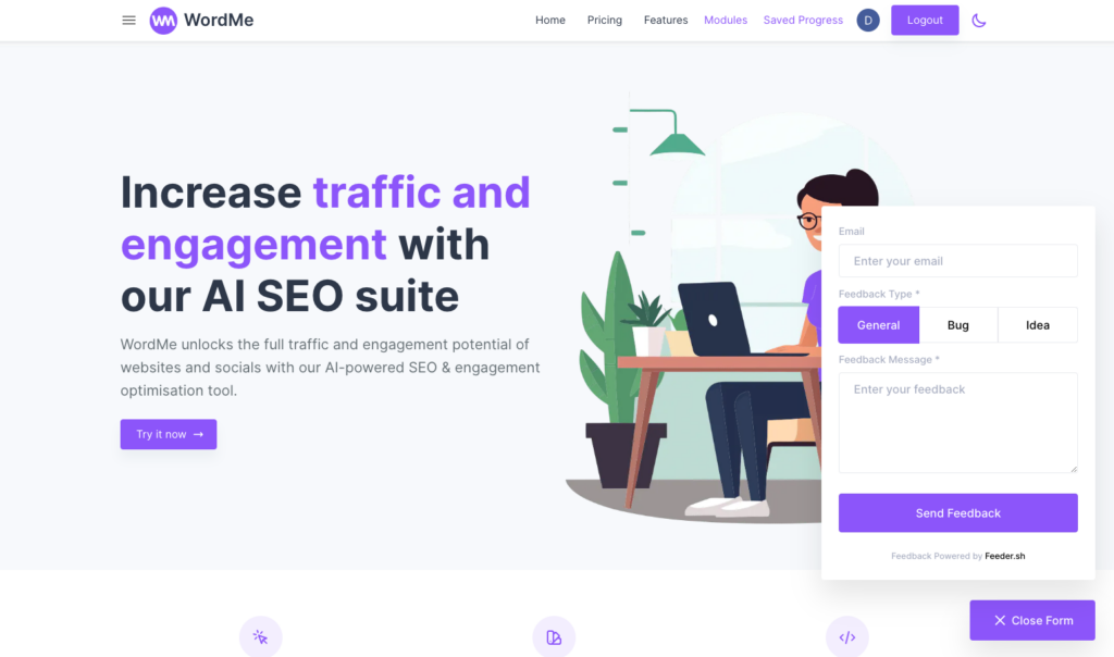 Introducing WordMe, the cutting-edge AI SEO tool designed to supercharge your digital content and optimize your website's search engine performance. Powered by advanced natural language processing and machine learning algorithms, WordMe revolutionizes the way you create and optimize content for maximum visibility and organic traffic.