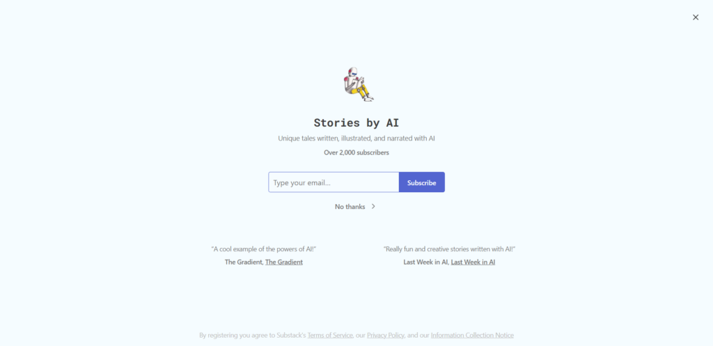 Unique tales written, illustrated, and narrated with AI. Click to read Stories by AI, a Substack publication with thousands of readers.