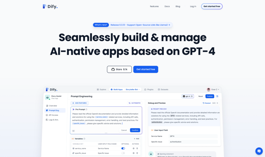 Dify.AI is an open source platform for LLMOps(https://github.com/langgenius/dify) that helps developers build AI applications more simply and quickly, based on different large language models. Its core concept is to define all aspects of an AI application, including prompts, contexts, and plugins, through declarative YAML files. Dify provides visual orchestration of prompts, operations, dataset management, and more. Create an AI app in minutes or integrate LLM into your app for continuous improvement.