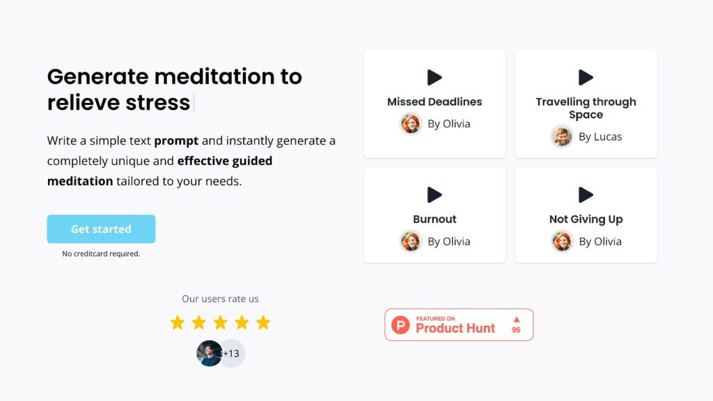 Generate a guided meditation tailored to your needs with just a simple text prompt. Many people quit guided meditations simply because they can't find the right guided meditation at the right time. Either the topic of a guided meditation doesn't resonate with them, the voice is not soothing, or the meditation is too long or too short. Introducing Guided, a tool to generate guided meditations you could never dream of: write a text prompt on what the guided meditation will be about, choose a soothing voice, and select a duration that fits your schedule, and enjoy instantly an effective guided meditation that suits your needs.