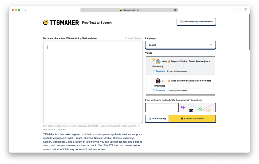 TTSMaker is a completely free online text-to-speech tool that supports unlimited usage, including commercial use. With over 200 AI voices and support for multiple languages including English, French, German, Spanish, Arabic, Chinese, Japanese, Korean, Vietnamese, and more, you can choose from a variety of voice styles to read your text and e-books aloud. You can also download the synthesized audio files. No registration or payment is required, you can use it directly online for free forever.