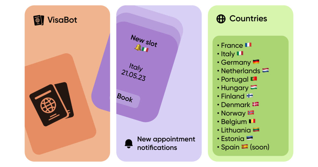 Supporting a broad array of countries, VisaBot is your comprehensive solution for Schengen visa appointments in the UK. Whether you're heading for a Tuscan vacation or a Nordic adventure, VisaBot transforms the often daunting visa appointment booking process into a seamless, user-friendly experience. Turn to VisaBot, your AI-powered, efficient assistant for a stress-free Schengen visa journey.