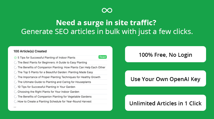 Create 100+ SEO Articles in 1 Click. 100% Free, No Login. Use your own OpenAI Key.