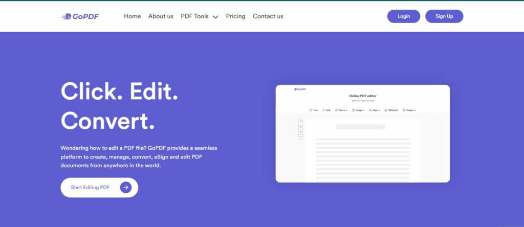 GoPDF is an online PDF editor that is designed to meet the specific needs of its users. GoPDF provides document editing benefits by its AI-powered dynamic, and also offers AI Chat with PDF tool. PDF editing tools offered by our platform include useful features such as merging, editing, and e-signing.