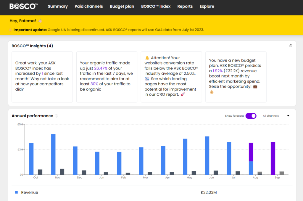 ASK BOSCO is an AI-powered analytics tool that reduces ad spend & increases sales. It predicts where to allocate your online spend across all channels for maximum return, enabling you to forecast future performance with 96% accuracy.