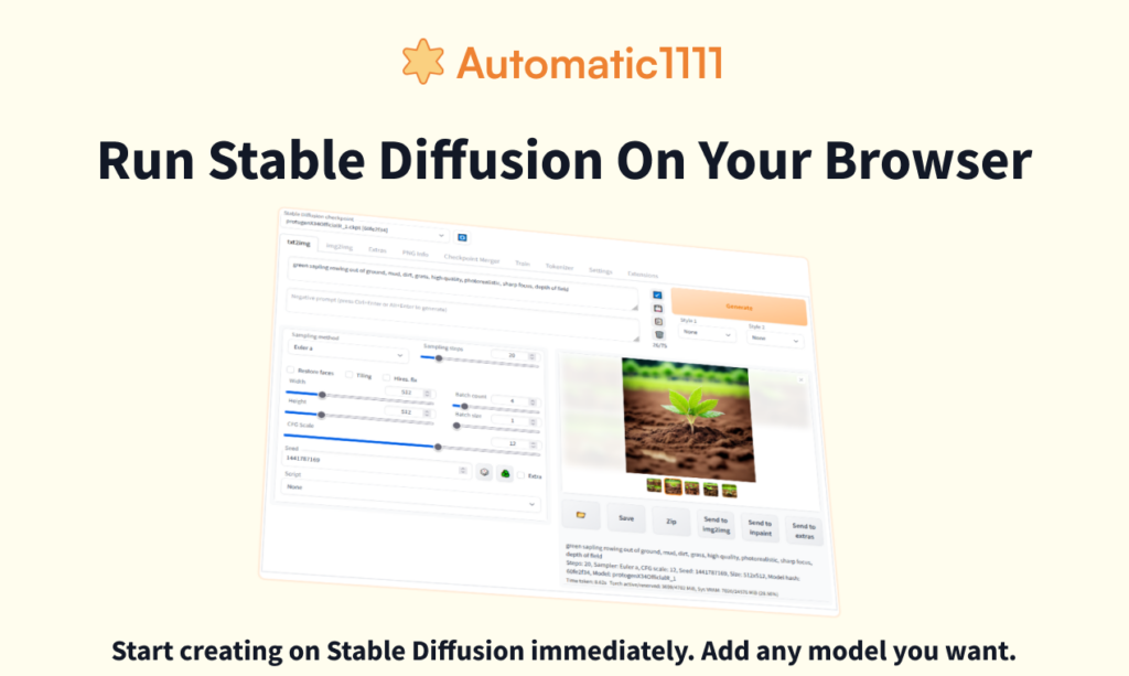 The cheapest and fastest way to get Stable Diffusion AI models up and running. Run Stable Diffusion models, finetune AI art models, generate AI art, design, game assets, videos and more on the web browser. Without worrying about any setup or GPUs, Automatic1111.app enables anyone to run AI art models with just a click.