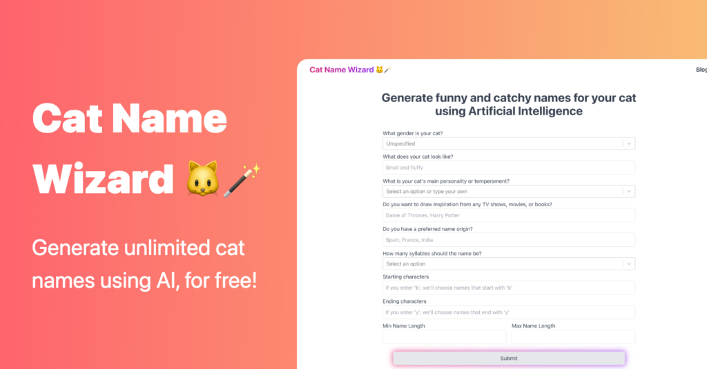 Cat Name Wizard is a simple tool to generate cat names. Just enter in your cat’s info and what you’re looking for, and see results in seconds. Free, simple, and fun!