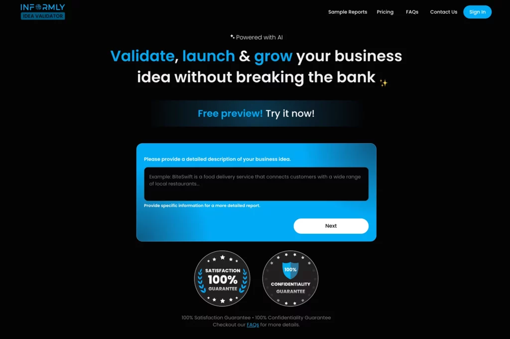 Informly is an AI-powered tool that streamlines the market research and idea validation process. Users get access to customized, actionable reports, such as validation reports, pitch deck guides, launch plans and many more.