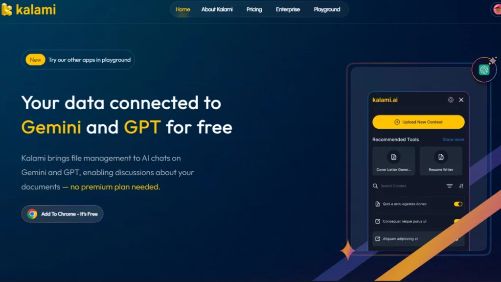 Kalami AI is a file management tool that connects seamlessly with AI platforms such as Gemini and ChatGPT. By integrating directly with gemini.google.com and chat.openai.com, it allows users to upload documents and web pages to discuss the contents with AI. Improving understanding and productivity without the need for expensive subscriptions.