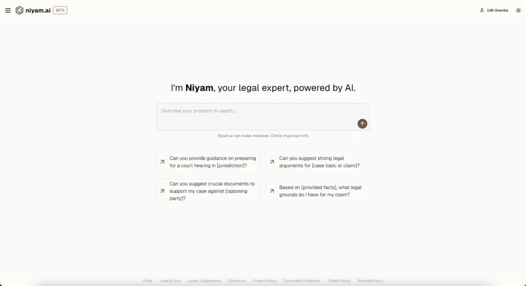 Niyam.ai leverages cutting-edge AI to simplify legal tasks such as document drafting, compliance checks, and research. Our platform saves time, reduces errors, and offers advanced features tailored for legal professionals, MSMEs and Corporates. Its unique selling point is its ability to generate high-quality legal content while maintaining accuracy and compliance with local regulations. Niyam.ai also provides customizable templates for various legal needs, ensuring users can adapt the platform to their specific workflows.