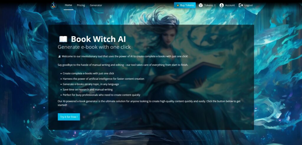 Book Witch AI is a groundbreaking AI-powered tool designed to simplify and speed up the process of e-book creation. With a single click, users can generate complete e-books, minimizing the time spent on research and manual writing. Its capabilities include handling content on any topic and supporting multiple languages, making it a versatile tool for various content needs. Ideal for busy content creator