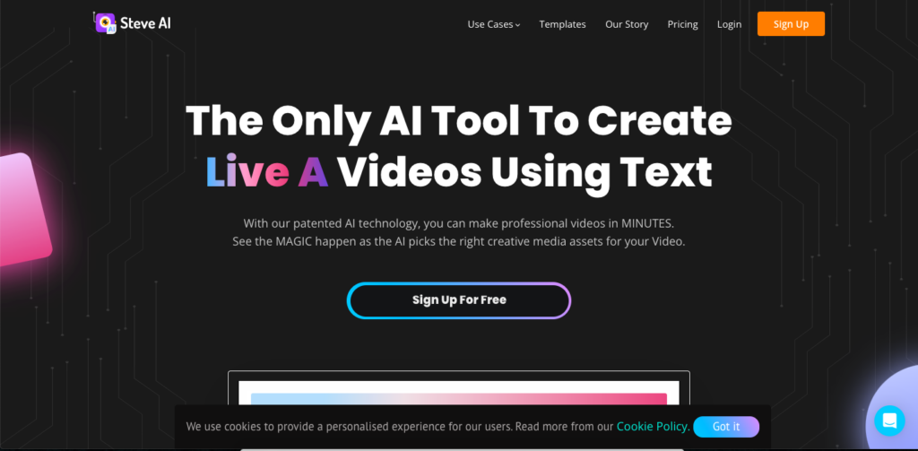 Steve AI is the only automated video making tool to create Live Action and Animation videos using Text.