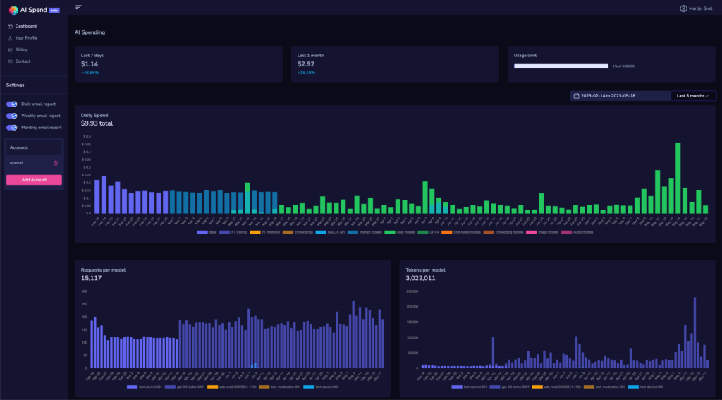 A.I. Spend is the perfect solution for solopreneurs, indie hackers, and businesses that use OpenAI APIs. Our tool helps monitor your usage and costs, and our intuitive dashboard makes it easy to understand analytics and charts that help you make better decisions about your OpenAI usage. With AI Spend, you will never be surprised by your OpenAI bill again.