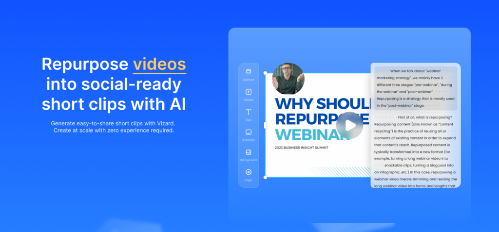 Vizard is an AI-powered video editor designed for marketers and creators to turn long form videos into social-ready short clips.