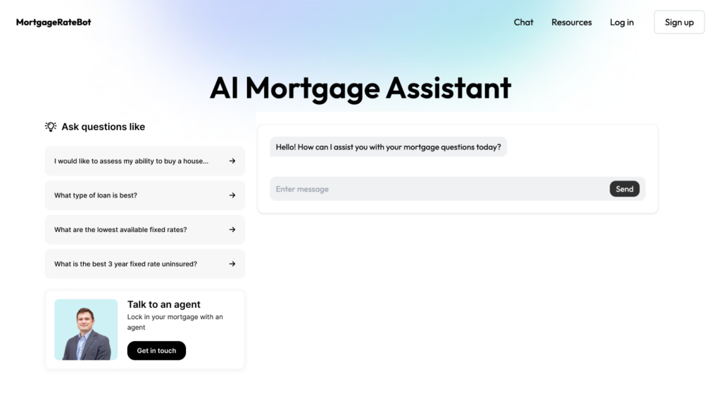 Discover the future of mortgage exploration with our revolutionary AI Chatbot. Powered by advanced AI and web scraping technology, our bot compiles Canadian mortgage rates and data, performs personalized affordability and payment calculations, and provides insights into Canadian mortgage products. Navigate the complex world of mortgages with ease and confidence, making informed decisions tailored to your needs. Experience an innovative, time-saving approach to mortgage shopping with our AI assistant - your digital partner in the Canadian real estate market.
