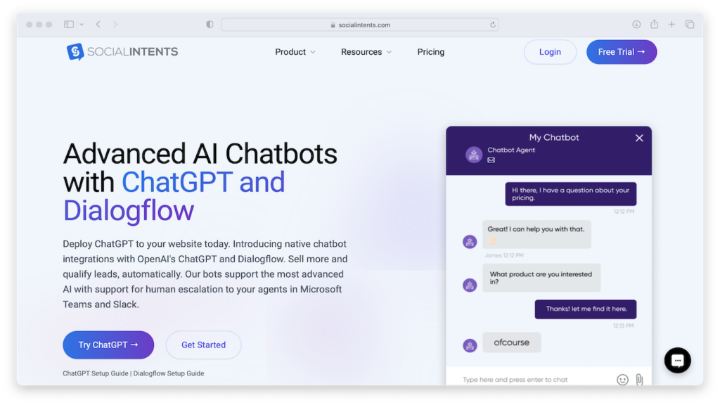 Live Chat by Social Intents is a live chat powered by ChatGPT and Dialogflow that allows you to chat with website visitors from Microsoft Teams and Slack and escalate from ChatGPT to Humans or have ChatGPT pick up when your agents are unavailable.