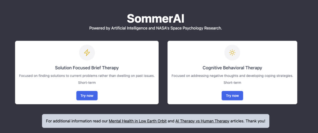 SommerAI is a revolutionary AI therapist that offers evidence-based approaches such as Cognitive Behavioral Therapy (CBT), Solution-Focused Brief Therapy (SFBT), and Retroactive Resolution Therapy (RRT) to provide personalized mental health support.