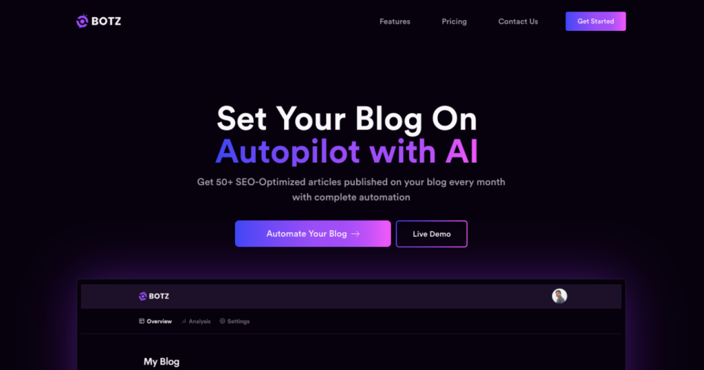 Get 50+ SEO-Optimized articles published on your blog every month with complete automation with help of AI Content Botz powered by GPT-4.