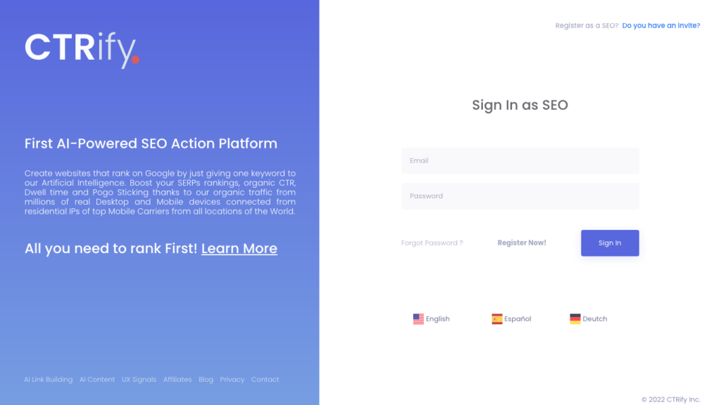 First AI-Powered SEO Action Platform Create websites that rank on Google by just giving one keyword to our Artificial Intelligence.
