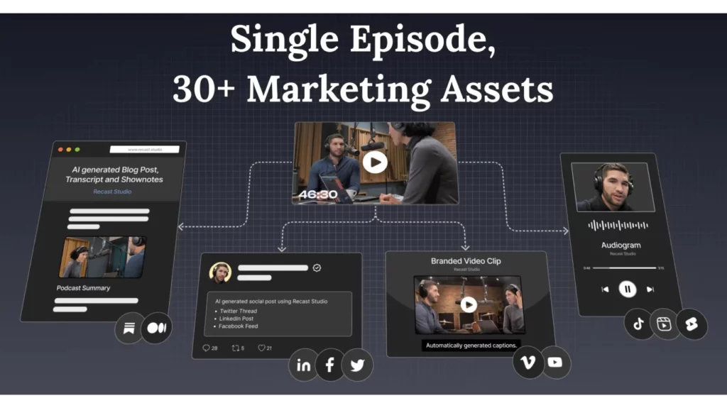 Recast Studio automatically turns your podcast episode into short video clips & writes show notes, blog posts, social media posts and more in minutes.