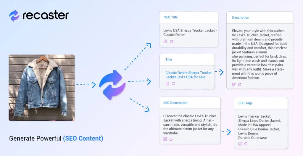 Recaster AI is your personal e-commerce assistant, designed to generate SEO content based on your product images. Simply add your product images or import your data, and Recaster AI will produce content for every necessary field on your e-commerce platform, be it Shopify, WordPress, Amazon, Ali Baba, your custom e-commerce app, and more.