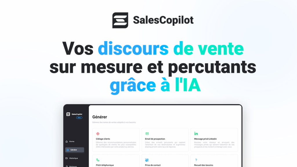 Sales Copilot is a revolutionary french AI-based sales tool designed to supercharge your business performance. Catering specifically to entrepreneurs, startups, and sales professionals, our platform generates personalized sales scripts to elevate your conversion rates and boost sales productivity. Whether it’s improving customer targeting, crafting compelling pitches, or overcoming objections, Sales Copilot is your trusted partner in navigating the world of sales. Experience the power of an ultra-optimized AI collaboration and transform your sales approach today.