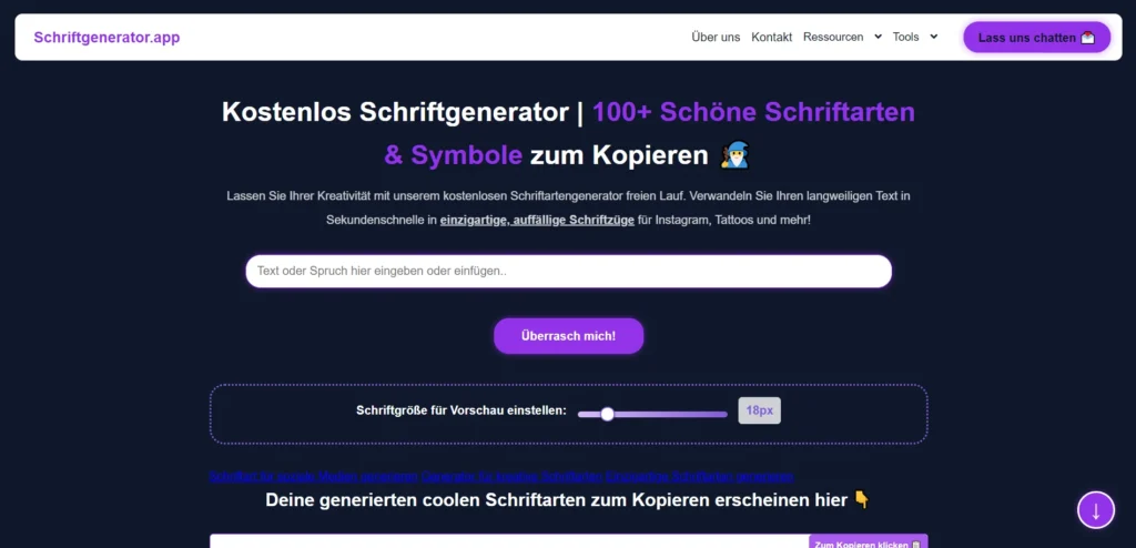 Schriftgenerator App: Ihr kostenloser Online-Dienst für stilvolle Textgestaltung. Verwandeln Sie einfach Ihren Text in kreative Schriftarten und Designs. Perfekt für Social Media, Messaging und mehr. Generieren, kopieren, einfügen – so einfach war kreatives Schreiben noch nie.
