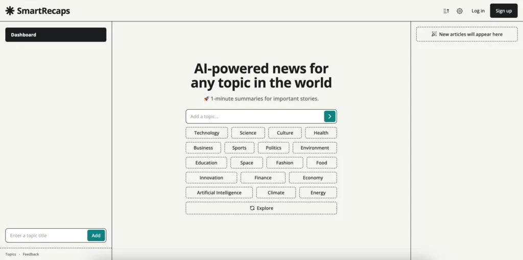SmartRecaps provides a free-to-read platform where you catch up on the news for your favourite topics in bite-size recaps. Each topic is curated with the assistance of AI and every recap can be expanded on for a deeper understanding of the story at hand.