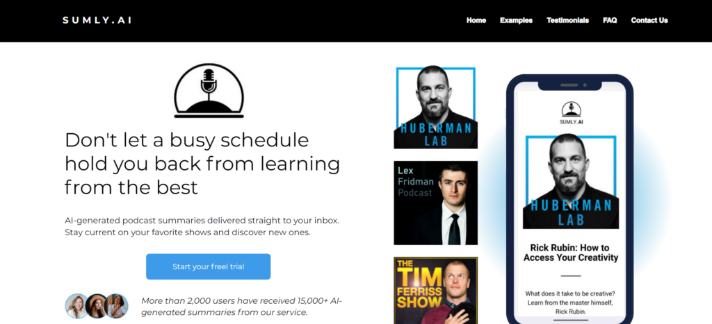 SumlyAI is a revolutionary AI-powered platform that offers summaries of podcasts. Our cutting-edge technology enables us to provide fast and accurate summaries of your favorite podcasts, delivered straight to your inbox. With SumlyAI, you can stay up to date on the latest episodes of your favorite podcasts, without having to spend hours listening to them in full. Whether you’re short on time or just want to get a quick overview of the key points, SumlyAI has you covered. Sign up today!