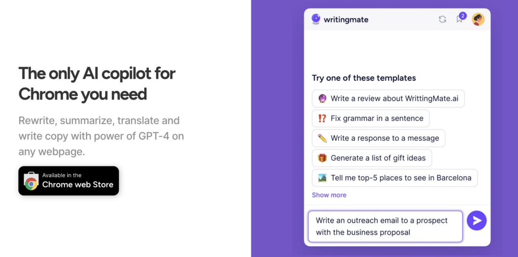 WritingMate.ai is the #1 ChatGPT and GPT-4 powered browser extension. Write emails, messages and many more in seconds.