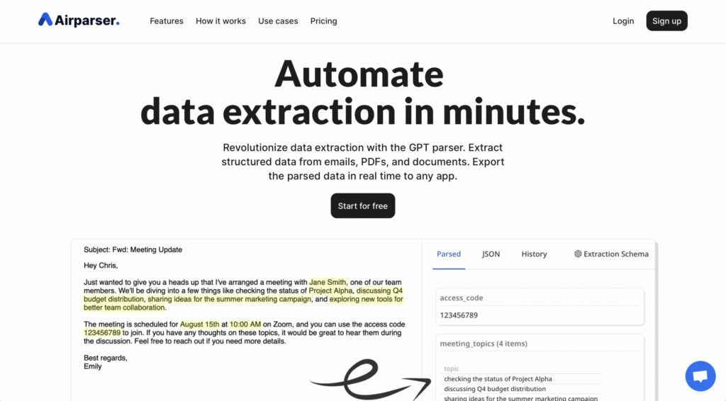 Revolutionize data extraction with the GPT parser. Extract structured data from emails, PDFs, and documents. Export the parsed data in real time to any app.